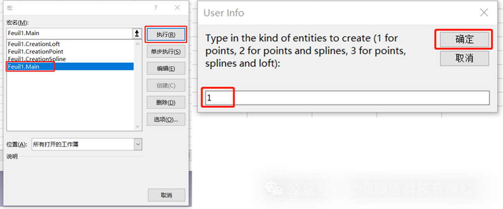 打开Excel 文件,点击开发工具-宏,执行Feuil1.Main,User Info输入1/2/3后,点击确认: