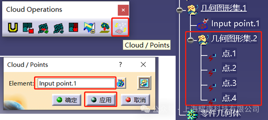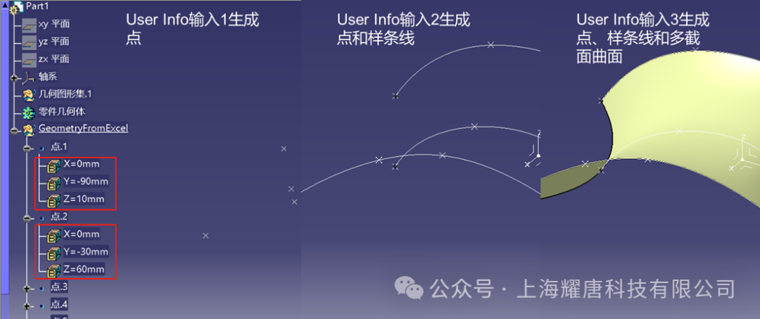 Excel 宏命令运行完后,可以看到CATIA 界面中已经自动生成Excel 中点数据,且可以看到点的三维坐标参数。(同理可以试试User Info输入2/3的生成效果)