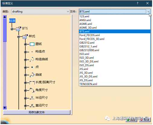 在标准定义窗口,左侧选择 Drafting,之后再右侧下拉列表选择需要调整的标准文件。
